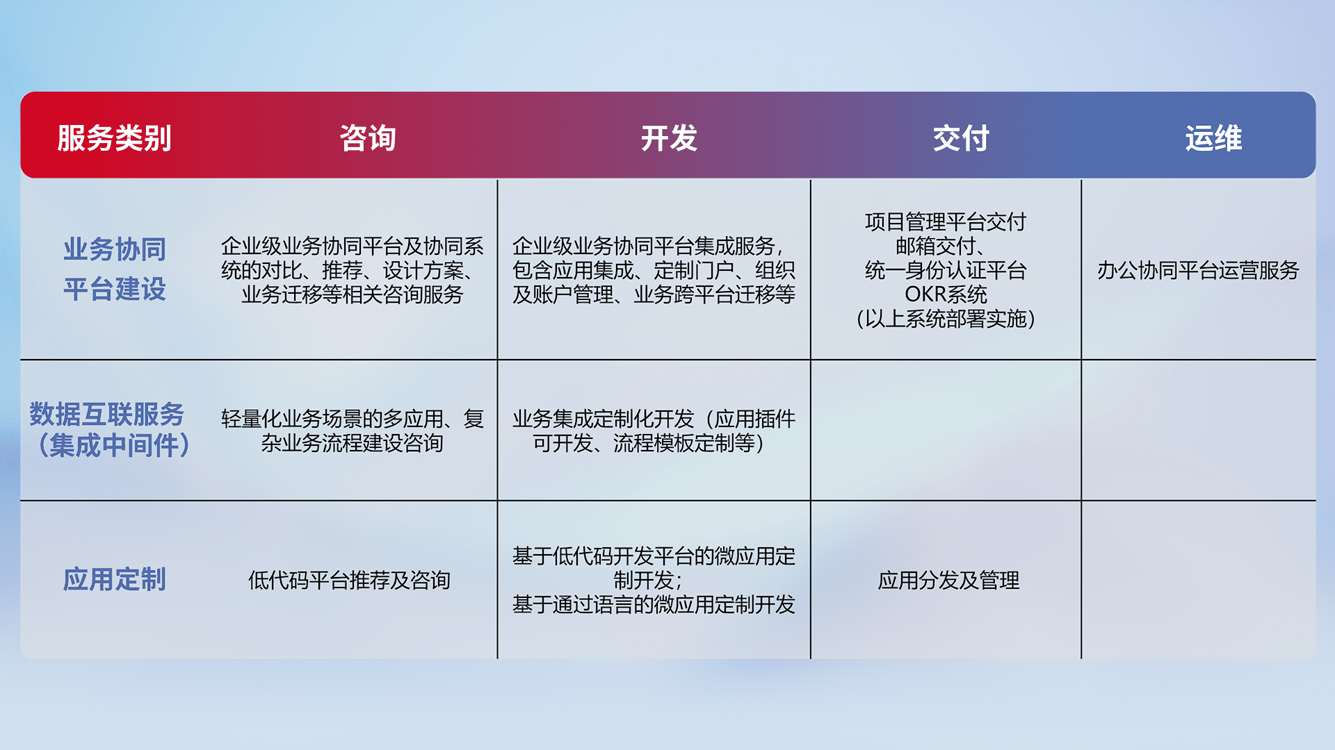 针对钉钉、、、企微、、、IDaas等平台级产品提供产品的规划、、、、方案、、、、交付、、定制化开发等服务,,,,实现如统一协同办公、、、、智能客户服务、、、混合会议管理、、、智能数据查询、、、等业务场景,,,,实现数字化转型。。。